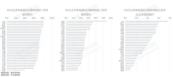 2023上半年,在已购家庭用户,甘肃、吉林、重庆、青海四省的一车渗透率均超过80%,处于领衔位置;受惠于电动车支持政策等,海南领衔二车渗透率排行,且遥遥领先,其次是天津、浙江、云南、广西与山东,都超过30%;上海领衔已购家庭的三车渗透率排行,其次是浙江、海南;