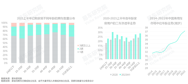 2023上半年,虽然中年用户的多车家庭占比相对较低,但2020-2023上半年,中国各年龄段的二车家庭渗透率都在提升,以及中国车市的中位年龄也在提升,2022年升至37.2岁,2023-2026年仍将持续提升,不仅说明多车家庭车市有较大提升空间,而且中年车市将成为核心战场。