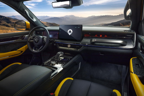 内饰设计方面,山海炮性能版颠覆传统,以豪华和科技定义高品质越野。其内饰采用全黑点缀金黄包覆,搭配哑光电镀装饰,豪华质感扑面而来。车内配备12.3英寸仪表+14.6英寸悬浮中控屏,增强了科技感的同时,也将各种行车信息一览无余地呈现,让驾驶者对车况、路况了如指掌。