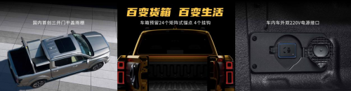 国内首创三开门平盖雨棚,电动控制,可拆卸隔断,增加空间百变性,玩转全场景皮卡生活。
