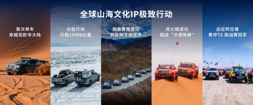 长城炮全球山海文化IP极致行动全面展开,携手山海文化共创官,与用户共赴山海、共享山海。山海炮首次单车穿越亚欧非大陆;北极行动,行程2万8千公里,成功抵达北极圈;探索香格里拉、共赴林芝桃花节;双火炮 1分35秒成功挑战“沙漠珠峰”;出征阿拉善,勇夺长城炮T3挑战赛冠军。