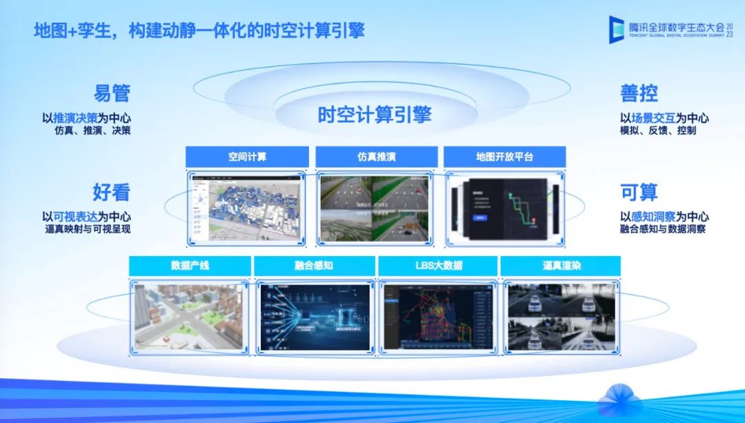 李学朝表示,腾讯已经通过深度整合腾讯地图与腾讯数字孪生产品,构建起了包括数据产线、融合感知、LBS大数据、逼真渲染、空间计算、仿真推演及地图开放平台七大能力,具备完善、高效、动静一体特征的时空计算引擎。