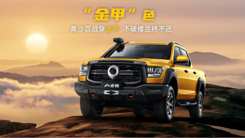 山海炮性能版设计理念源于中国文化“永不妥协”的进击精神。采用铿锵靓丽的“金甲”专属车身颜色,“金甲”是战衣,是勇于挑战、不断突破的越野精神,更是中国皮卡进击全球、剑指前三的勇气与实力,黄沙百战穿金甲,不破楼兰终不还。