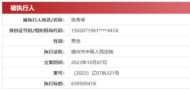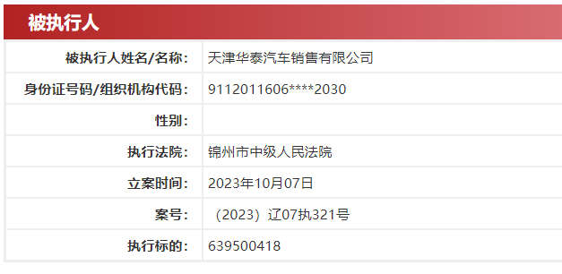 中新经纬10月8日电 据中国执行信息公开网8日消息,华泰汽车、天津华泰汽车销售有限公司(下称“天津华泰”)及张秀根10月7日新增一则被执行人信息,执行标的约6.4亿,案号为(2023)辽07执321号,执行法院为锦州市中级人民法院。