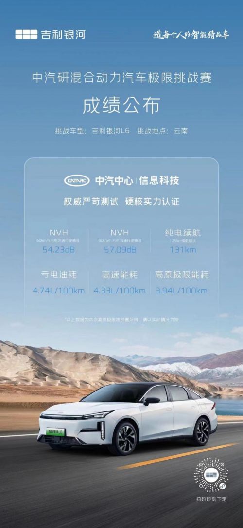 总的来说,吉利银河L6在安全、性能、舒适、智能全面革新,整体机械素质超越同级,混合动力汽车极限挑战赛的各项成绩印证了这款行业标杆级电混家轿的确值得信赖。秉承着“造每个人的智能精品车”理念的吉利,无疑对银河L6寄予厚望,并实实在在的做到了多个“第一”,关于车型的更多亮点和细节需要消费者亲自去体验和发现。