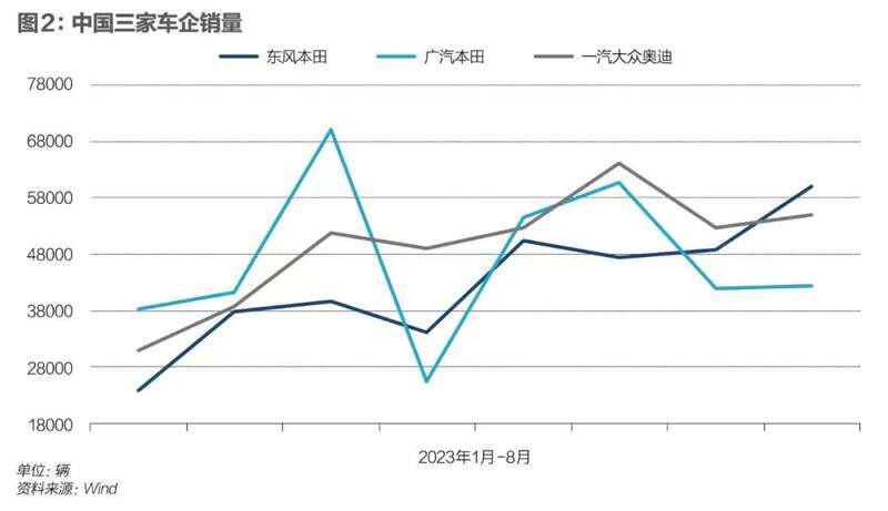 财经汽车研究中心选取了三家参与价格战的典型车企,即东风本田、广汽本田与一汽奥迪进行分析。万得数据显示,这三家车企在2023年上半年,3月和4月的月销量走势十分相似,3月销量升至顶峰,4月销量跌幅最大。尤其是广汽本田,4月销量环比下降63.7%,不到前一个月的三分之一。