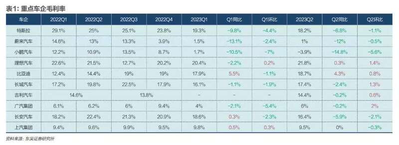 东吴证券研究所的数据也显示,上半年轰轰烈烈的价格战似乎并没有给有些企业带来想象中的收益。特斯拉、蔚来和小鹏上半年毛利率下落幅度较大,一季度、二季度均同比下降10%左右。尤其是小鹏汽车,二季度毛利率同比下降14.8%。