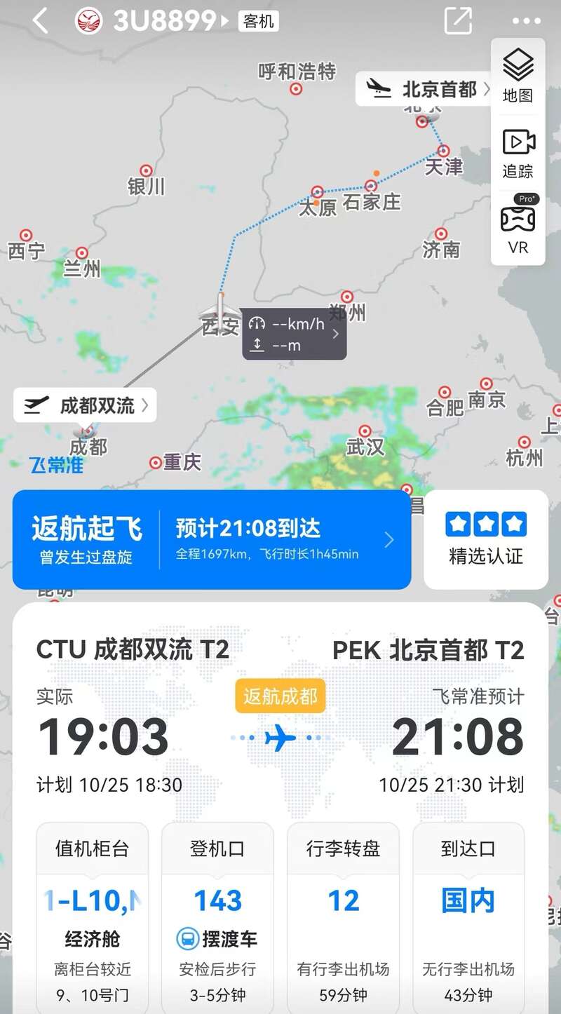 25日21时45分许,红星新闻记者查询飞常准App了解到,川航3U8899由空客A321-211飞机执飞,于25日19时03分从成都双流机场起飞,计划于21时30分抵达北京首都机场。相关页面还显示“曾发生过盘旋”,该航班为“返航起飞”状态。