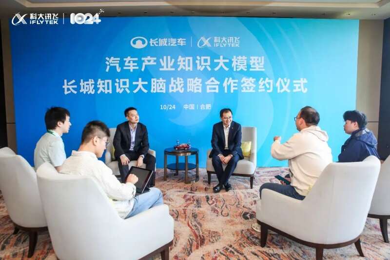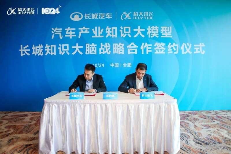 10月24日,正值2023科大讯飞全球1024开发者大会和2023科大讯飞智能汽车新品发布之际,长城汽车股份有限公司与科大讯飞股份有限公司签署了关于产业大模型及知识大脑战略合作协议。长城汽车副总裁佘尚锋、科大讯飞副总裁刘俊峰,以及双方高管出席了签约仪式。
