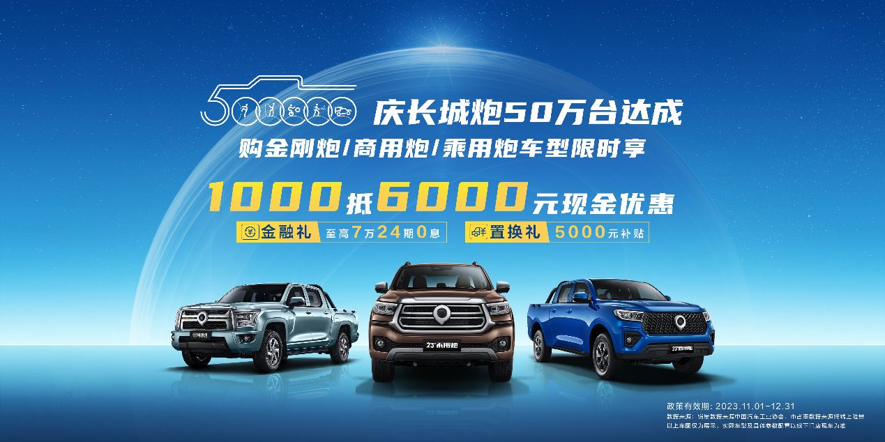 长城炮品牌四周年,销量突破50万台,成为首个突破50万台的中国高端皮卡品牌。感恩回馈用户支持与厚爱,长城炮推出“庆长城炮50万台达成”限时钜惠活动。即日起至12月31日,用户购买长城炮旗下任意一款金刚炮、商用炮、乘用炮车型,限时享“1000元抵6000元”现金优惠。同时还尊享“至高7万24期0利息”金融礼、“5000元补贴”置换礼。