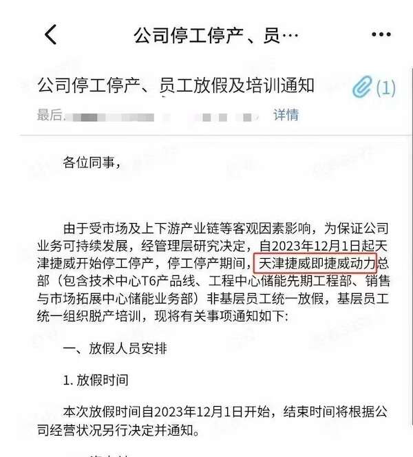 近日,捷威动力一则名为《公司停工停产、员工放假及培训通知》的内部通知流出。根据上述通知,受市场及上下游产业链等客观因素影响,为保证公司业务可持续发展,经管理层研究决定,自2023年12月1日起天津捷威开始停工停产,停工停产期间,天津捷威即捷威动力总部(包含技术中心T6产品线、工程中心储能先期工程部、销售与市场拓展中心储能业务部)非基层员工统一放假,基层员工统一组织脱产培训。