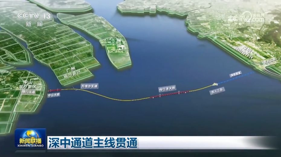 央视网消息(新闻联播):国家重大工程深中通道,联通深圳、中山、广州三地,是目前世界上综合建设难度最高的跨海集群工程。今天(11月28日),深中通道主线贯通。