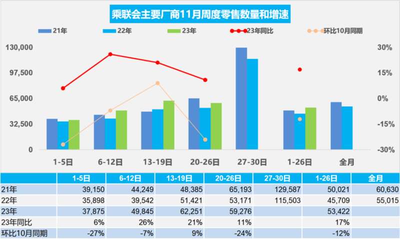 11月1-26日,乘用车市场零售138.9万辆,同比去年同期增长17%,较上月同期增长下降12%,今年以来累计零售1,865.6万辆,同比增长4%。