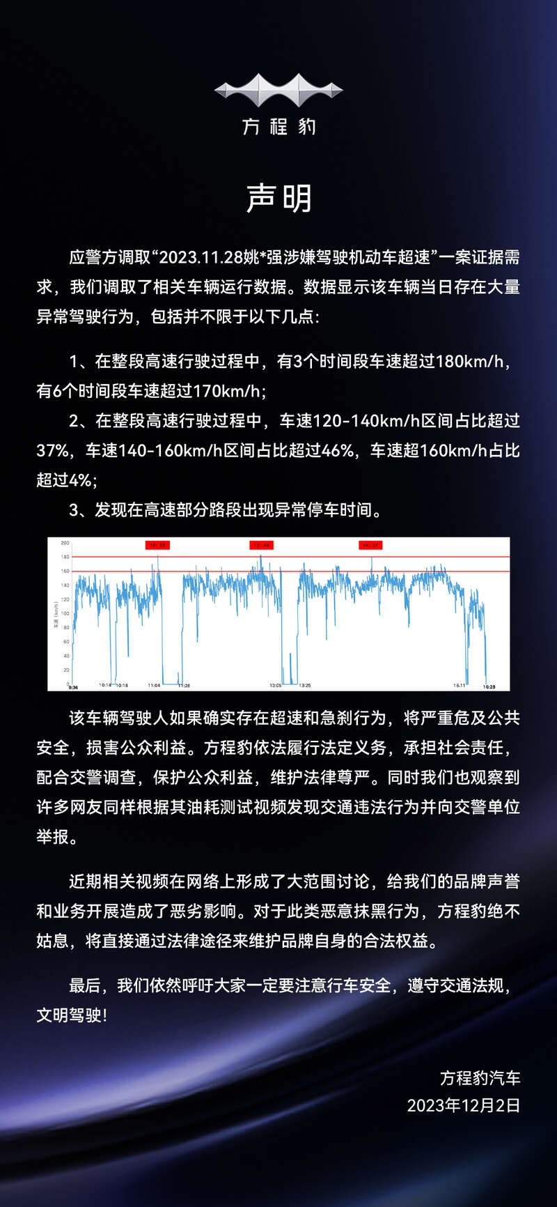 方程豹表示,应警方调取“2023.11.28姚*强涉嫌驾驶机动车超速”一案证据需求,调取了相关车辆运行数据。数据显示该车辆当日存在大量异常驾驶行为,包括并不限于以下几点:1、在整段高速行驶过程中,有3个时间段车速超过180km/h,有6个时间段车速超过170km/h;2、在整段高速行驶过程中,车速120-140km/h区间占比超过37%,车速140-160km/h区间占比超过46%,车速超160km/h占比超过4%;3、发现在高速部分路段出现异常停车时间。