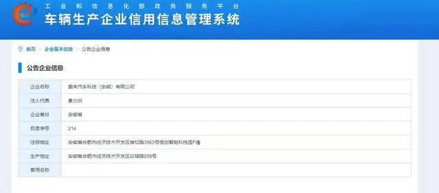 工信部网站车辆生产企业信用信息管理系统显示,企业名称为蔚来汽车科技(安徽)有限公司,法人代表为蔚来汽车总裁秦力洪,目录序号为214,这一序号对应的也正是《道路机动车辆生产企业及产品》企业申报车型公示详情中的目录序号。