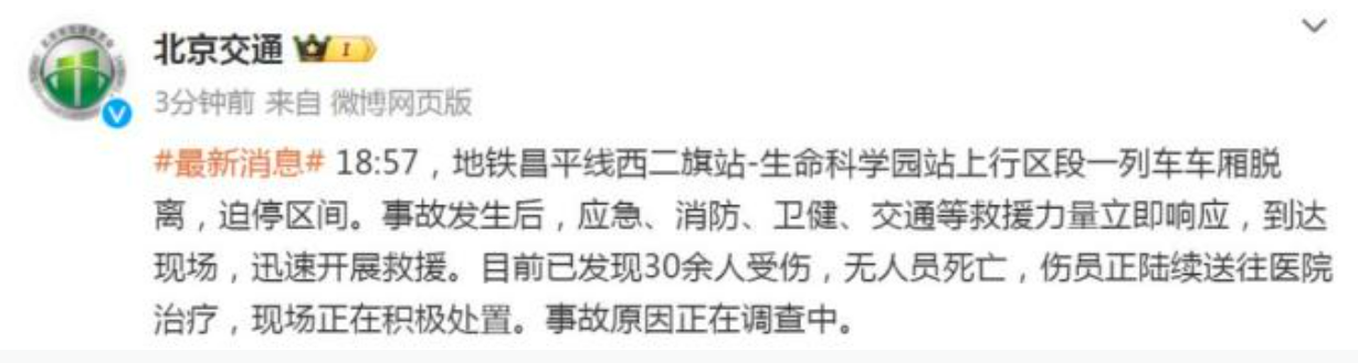 北京市交通委员会官方微博14日通报:18:57,地铁昌平线西二旗站-生命科学园站上行区段一列车车厢脱离,迫停区间。事故发生后,应急、消防、卫健、交通等救援力量立即响应,到达现场,迅速开展救援。目前已发现30余人受伤,无人员死亡,伤员正陆续送往医院治疗,现场正在积极处置。事故原因正在调查中。