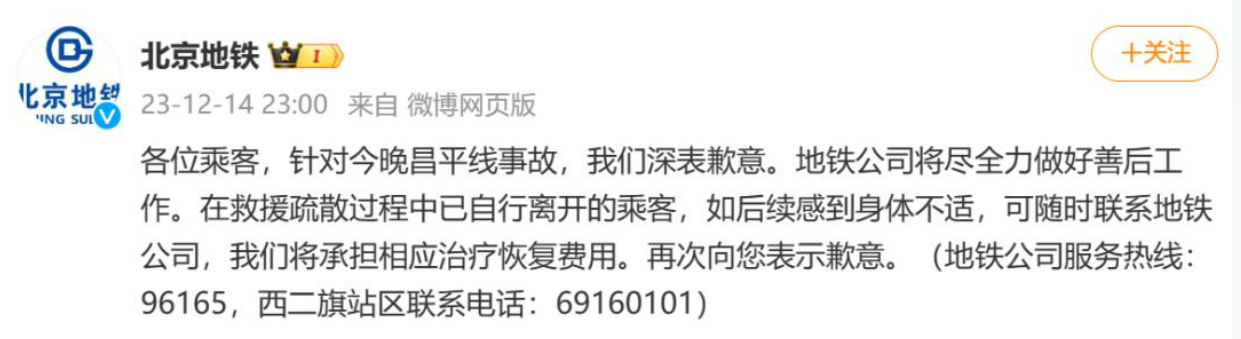23:00,@北京地铁 发博表示歉意:各位乘客,针对今晚昌平线事故,我们深表歉意。地铁公司将尽全力做好善后工作。在救援疏散过程中已自行离开的乘客,如后续感到身体不适,可随时联系地铁公司,我们将承担相应治疗恢复费用。再次向您表示歉意。