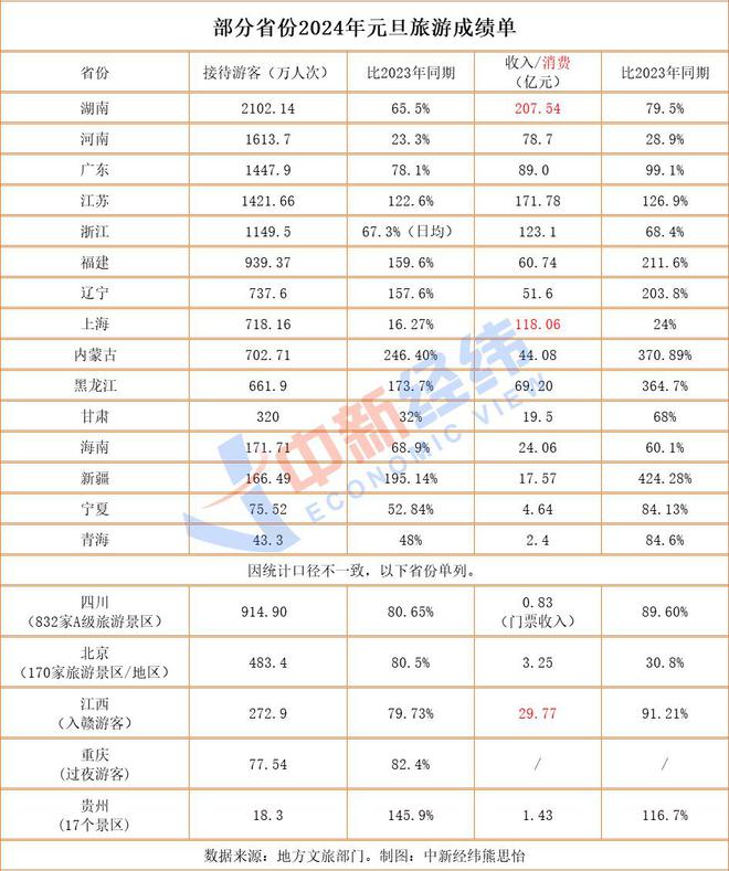 据中新经纬不完全统计,截至1月3日21时,全国已有20省份发布2024年元旦旅游数据。其中,湖南接待游客2102.14万人次,暂时领跑全国;河南接待游客1613.7万人次,位列第二;广东接待游客1447.9万,排名第三。此外,江苏、浙江两省游客接待量也超过千万。