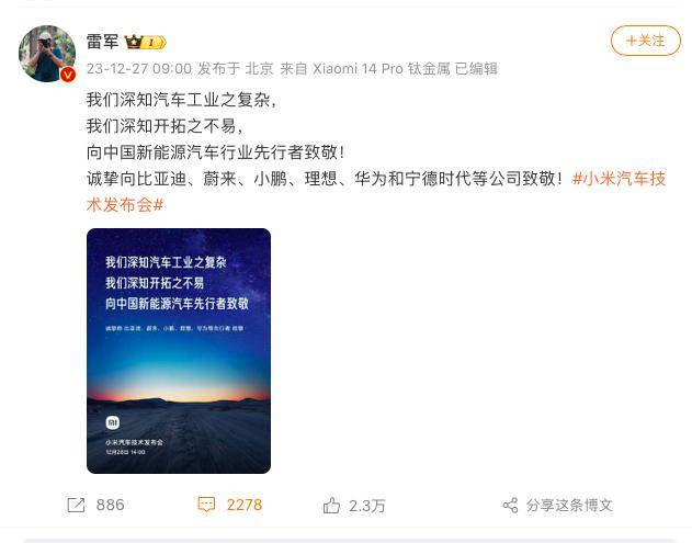 雷布斯为了给小米SU7造势,在微博致敬一众新能源“先行者”上了热搜,一众车企里“电池一哥”宁德时代很特别。雷军在提到宁德时代时还说,“我们要尊重科技”。