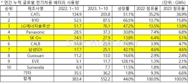 像宁德时代这样的锂电龙头,虽然全年数据还未公布,但将毫无悬念的连续7年蝉联全球出货量第一。据韩国机构SNE统计,2023年1-10月宁德时代全球市占率36.9%,领先第二名21.1%,同比去年装车量增长51.1%,市占率也在增长。
