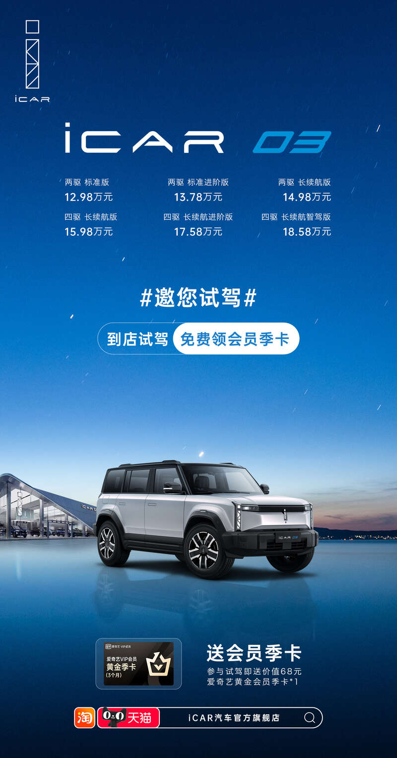 开启潮玩精彩体验,解锁新年更多不一样。活动期间,用户即可到店试驾iCAR 03,免费领会员季卡。只需打开天猫/淘宝APP搜索“iCAR汽车官方旗舰店”进店下订试驾参与,即送价值68元爱奇艺VIP黄金会员季卡,尽情探索“电动小卫士”的秘密,畅享趣玩新“视界”。