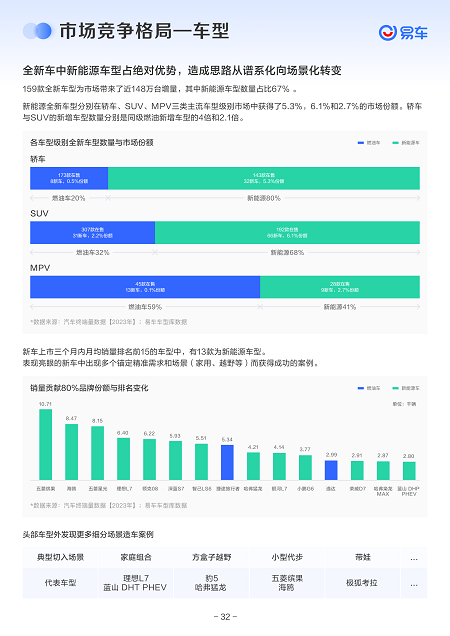 从车型角度来看,全新车中新能源车型占绝对优势,造成思路从谱系化向场景化转变。报告显示,2023年159款全新车型为市场带来了近148万台增量。其中新能源车型数量占比67%,分别在轿车、SUV、MPV三类主流车型级别市场中获得了5.3%,6.1%和2.7%的市场份额。轿车与SUV的新增车型数量分别是同级燃油新增车型的4倍和2.1倍。