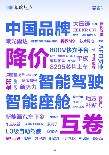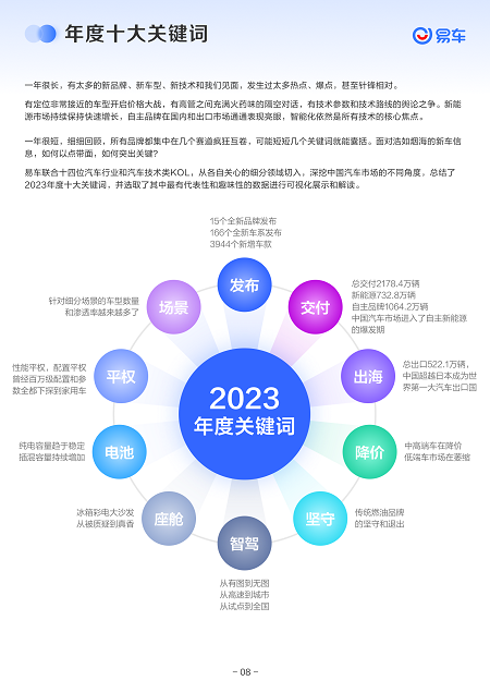 报告着重梳理了年度关键词。在此易车联合14位汽车行业和汽车技术类KOL,从各自关心的细分领域切入,深挖中国汽车市场的不同角度,总结了2023年度十大关键词,包括发布、交付、出海、降价、坚守、智驾、座舱、电池、平权、场景,并选取了其中最有代表性和趣味性的数据进行可视化展示和解读,阐述从政策、品牌、销量到产品力、智能化等方方面面的细节脉动。