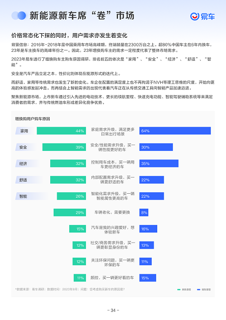 报告认为,地方补贴加上车企官降,让价格下探成为2023年的市场常态。而在价格常态化下探的同时,用户需求亦发生着变化。2023年易车进行了增换购车主购车原因调研,排名前五的依次是“家用”、“安全”、“经济”、“舒适”、“智能”。安全是汽车产品立足之本,性价比则体现在能源形式的迭代上。而舒适、家用三项传统需求也发生了新的变化。车企在配置的满足度上也不再拘泥于NVH等理工思维的尺度,开始向更高的体验感发起冲击。而再结合上智能需求的出现代表着汽车正在从传统交通工具向智能产品加速迈进。