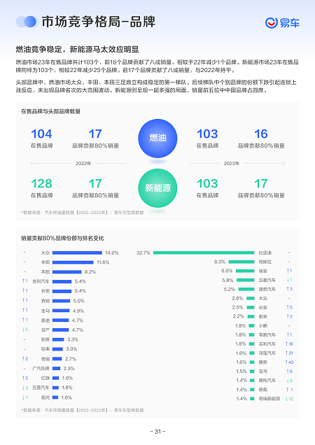 从市场竞争格局来看,燃油品牌竞争稳定,新能源品牌则马太效应明显。燃油市场2023年在售品牌103个,前16个品牌贡献了八成销量。相较于2022年分别减少1个品牌。新能源2023年在售品牌同样为103个,相较2022年减少25个品牌。前17个品牌贡献了八成销量,与22年持平。