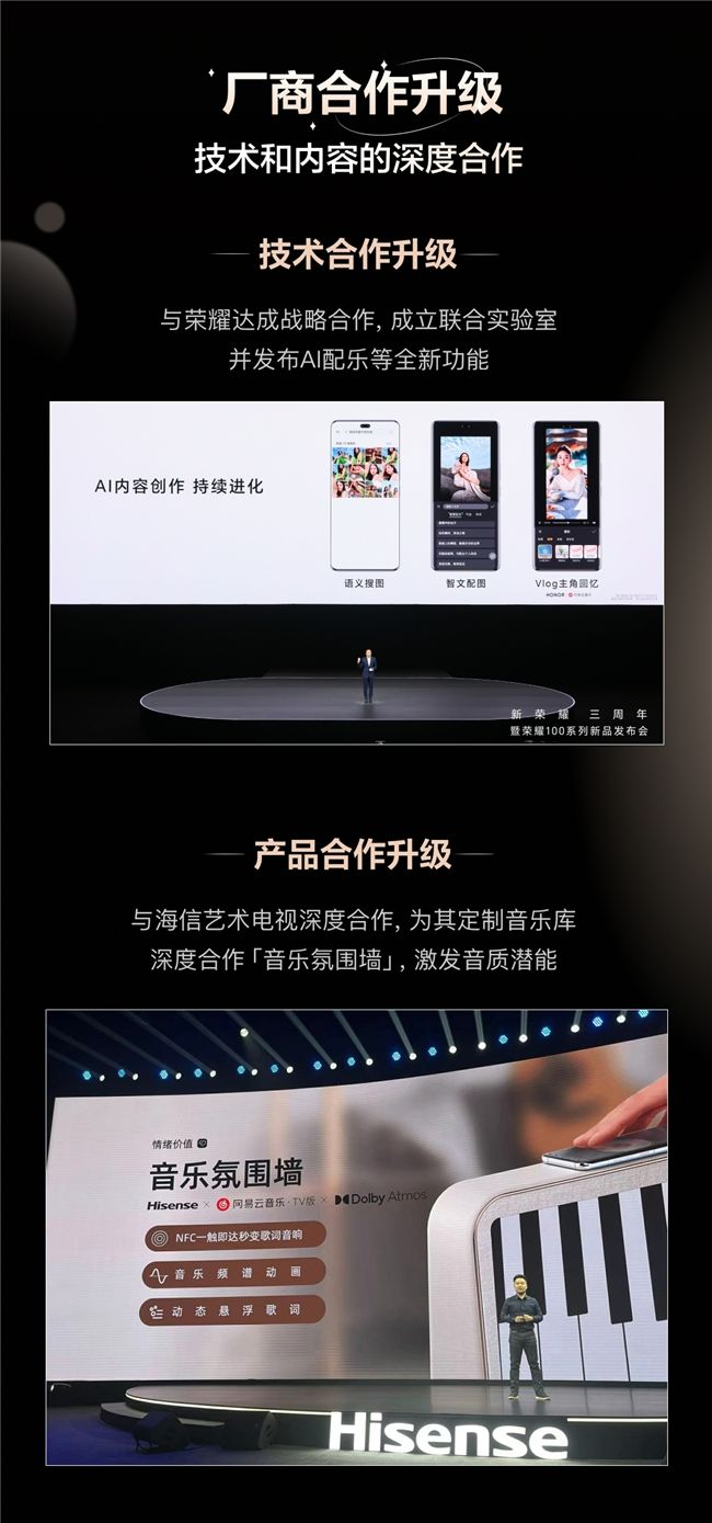 在厂商合作升级层面,网易云音乐智能设备业务在2023年也实现了从技术到产品及音质方面的立体合作升级。在技术合作方面,网易云音乐在过去一年与荣耀这样的业界知名品牌达成了战略合作,双方不仅成立了联合实验室,还共同在荣耀新品手机上发布了AI配乐及全新音乐应用,共同为荣耀手机用户带来更丰富、更悦耳的音乐体验。