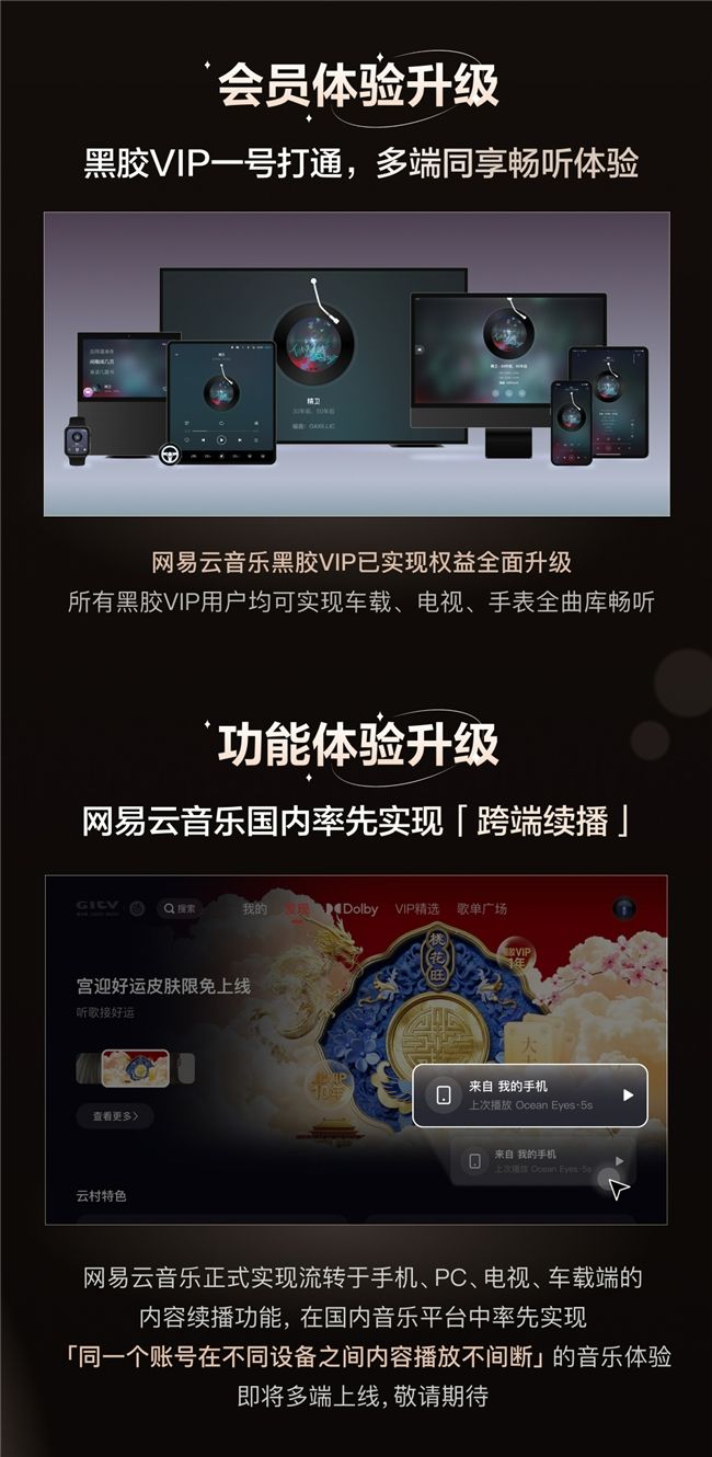 首先在用户服务层面,网易云音乐智能设备业务2023年在多个维度实现了“全面升级”。在会员体验升级方面,他们在岁末年初之际宣布正在进行“一号全通”的黑胶VIP会员权益升级试运营活动,让所有黑胶VIP用户在不同智能设备上都能畅享全曲库内容,这在会员售卖愈发“细分”的今天,无疑是面向用户真实需求做出的一次重要升级活动。