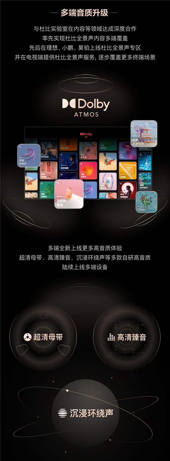 此外,网易云音乐也对其TV版产品也进行了重磅更新,针对用户极为关注的音质体验进行了全新升级。将杜比全景声、超清母带、沉浸环绕声、高清臻音等高品质音质带到TV版产品上,让所有大屏用户在家中也能尽享音乐美好。未来网易云音乐也将更好的音质内容赋能厂商,2024年将陆续上线更多终端场景及设备。