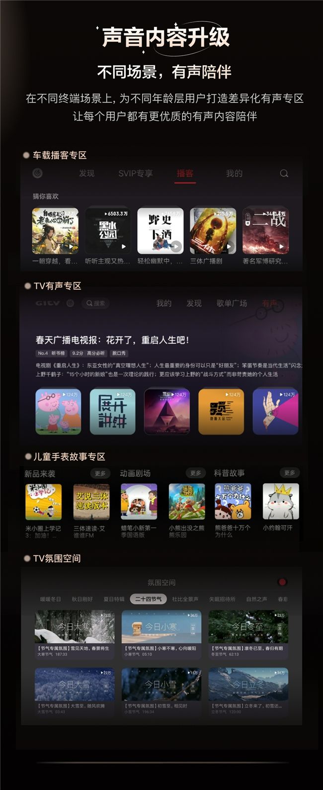 在声音内容升级方面,网易云音乐在2023年也完成了多项重要升级举措。在三大终端上,网易云音乐先后上线了车载播客专区、TV有声专区、儿童手表故事专区、TV版氛围空间等差异化的有声内容供给及专属功能,为不同年龄层用户带来更优质的有声内容陪伴。