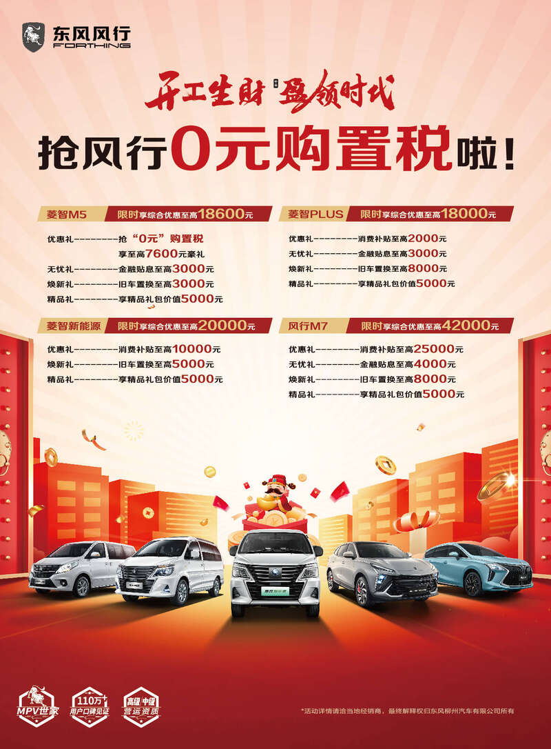 随着春节假期的结束,人们纷纷回到工作岗位上,借着新春开工之际,人们期盼在新的一年里,能如龙般矫健,事业腾飞;如龙鳞闪耀,生活美满。面对广大创富者对创富神车的迫切需求,东风风行菱智家族特意在众行业开工之际,开启“开工生财,盈领时代”的优惠促销活动,除了至高42000元的开工限时购车优惠外,还能参加限时抽奖得众多福利,优惠多多福利多多,菱智家族助力创富者在龙年踏上创富成功路。