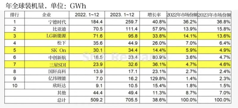 2023年全球动力电池使用量TOP10榜单:宁德时代连续7年蝉联冠军