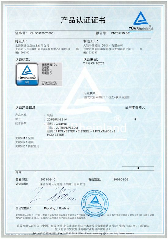 熊牌US2系列轮胎已获得第三方权威机构德国莱茵TUV官方认证。对坚固、避震、操控稳定性等方面的出色表现给予了高度认可。