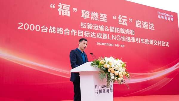 2024年3月28日,以“褔擎燃至 纭启速达”为主题的纭毅运输&福田戴姆勒2000台战略合作目标达成暨LNG牵引车批量交付仪式在江苏扬州圆满举行。宝应县政府、北京福田戴姆勒汽车有限公司、纭毅纭庆(扬州)运输有限公司、优秀驾驶员以及客户代表共同出席了本次交车活动。