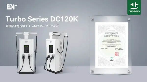 近日,EN+科技Turbo DC120K系列直流桩产品正式通过日本CHAdeMO机构测试,并获得机构颁发的认证证书。EN+科技正式成为中国首批荣获CHAdeMO最新充电标准Rev.2.0.2认证的充电桩厂家。