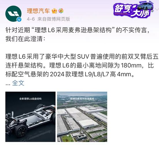 L6采用麦弗逊悬架结构?理想汽车:传言不实