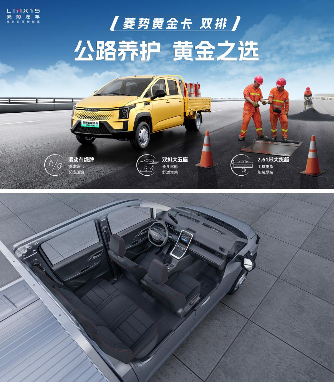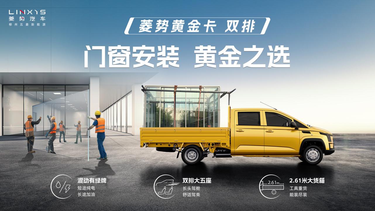 菱势黄金卡双排“全新混动技术+舒适双排设计”的双重独特优势,让用户能解锁更丰富、更细分的用车场景,也让黄金卡双排更能适应B端大客户和C端私营业主的需求。对于公路养护、园林绿化、工程施工等行业的B端大客户而言,黄金卡双排不仅能载人装货,其混动技术更能响应新能源政策、控制采购成本,并且有大品牌优良售后的保障。对于C端私营业主而言,菱势黄金卡双排兼顾了油车的超长续航与电车的更优路权、较低用车成本等优势,更有舒适驾乘、超大货箱、超强承载、强劲动力、超低油耗等特点,是门窗安装、果蔬零售等私营业主的黄金之选。