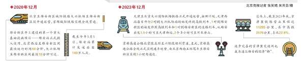 2023年12月,天津至北京大兴国际机场铁路正式开通运营,按照计划,天津西站每日开行2对到大兴机场站的始发终到高铁列车、1对到雄安新区的始发终到高铁列车和1对到雄安新区的过路列车,从雄安出发1.5小时可至天津西站,2个多小时可至河北唐山。同样在2023年12月,京雄高速公路北京段五环至六环段顺利贯通,至此,京雄高速公路全线正式实现通车运营,由北京西南五环驾车至雄安新区实现1小时内通达。