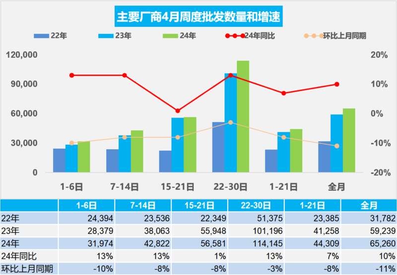 4月第四周批发日均11.4万辆,同比去年4月同期增长13%,环比上月同期下降3%。