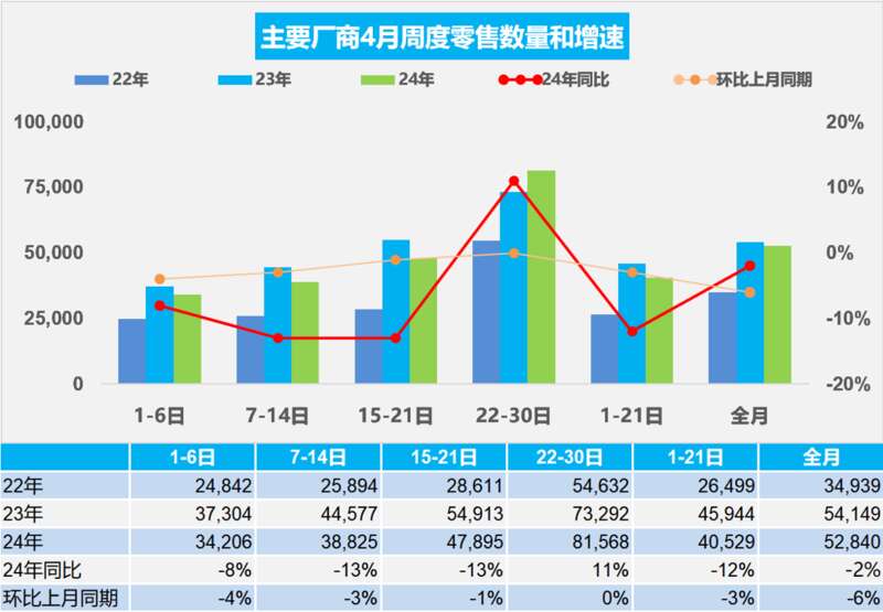 4月第四周全国乘用车市场日均零售8.2万辆,同比去年4月同期增长11%,环比上月同期持平。