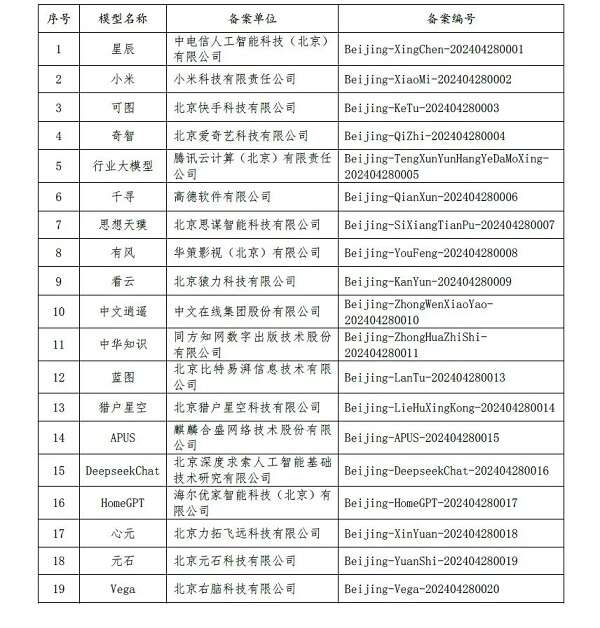 5月15日,北京市新增19款已完成备案的生成式人工智能服务名单。小米科技“小米”、易车“蓝图”、腾讯云“行业大模型”等19款大模型备案信息公示。