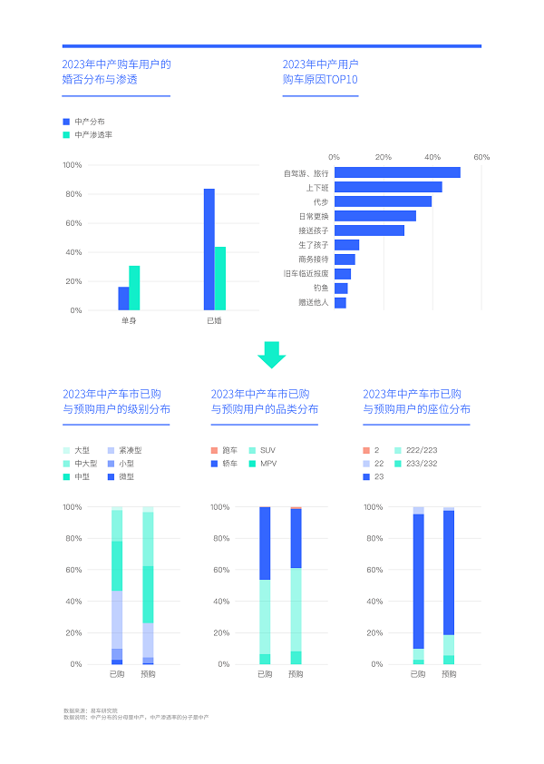 近几年,中国车市的单身化现象比较突出,大盘占比突破20%,但中产车市仍以家庭用户绝对为主,2023年的已婚占比高达83.85%,且在整个已婚家庭车市,中产的渗透率高达43.86%。家庭为主的特征,滋生了中国中产车市强烈的自驾游诉求,2023年自驾游位居中产用户购车原因的榜首,占比超过50%,高达51.41%,大幅领先上下班、代步。自驾游突出的现象,与多数中产家庭已解决首购,大规模进入增换购阶段密切相关,开始追求更多的“用车乐趣”;