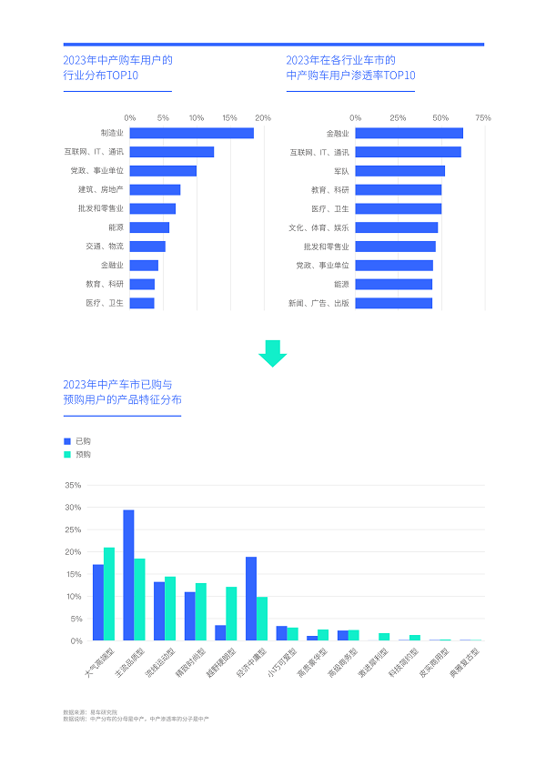 由于以高学历用户绝对为主,中国中产购车用户的就业集中互联网、金融、政府等优质行业。2023年,中产购车用户主要分布在制造业、互联网、政府等,同时在金融、互联网、教育、医疗、文化等行业车市,中产化非常显著,前两者中产占比都突破60%,后三者都高达50%上下;