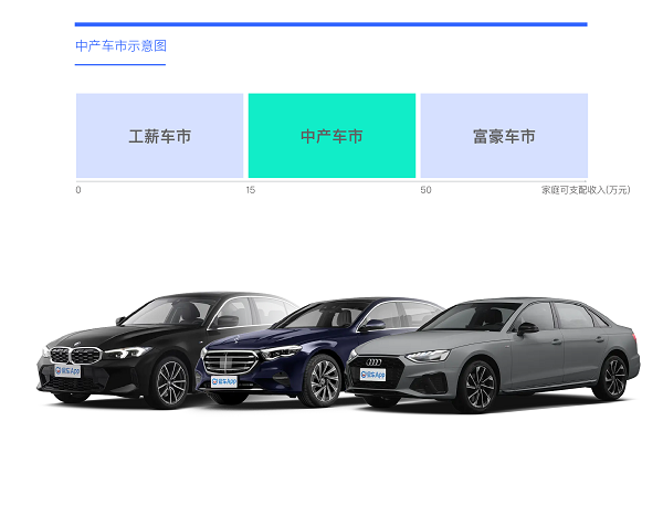 中产车市:由家庭年可支配收入15~50万元的购车用户组成的细分车市