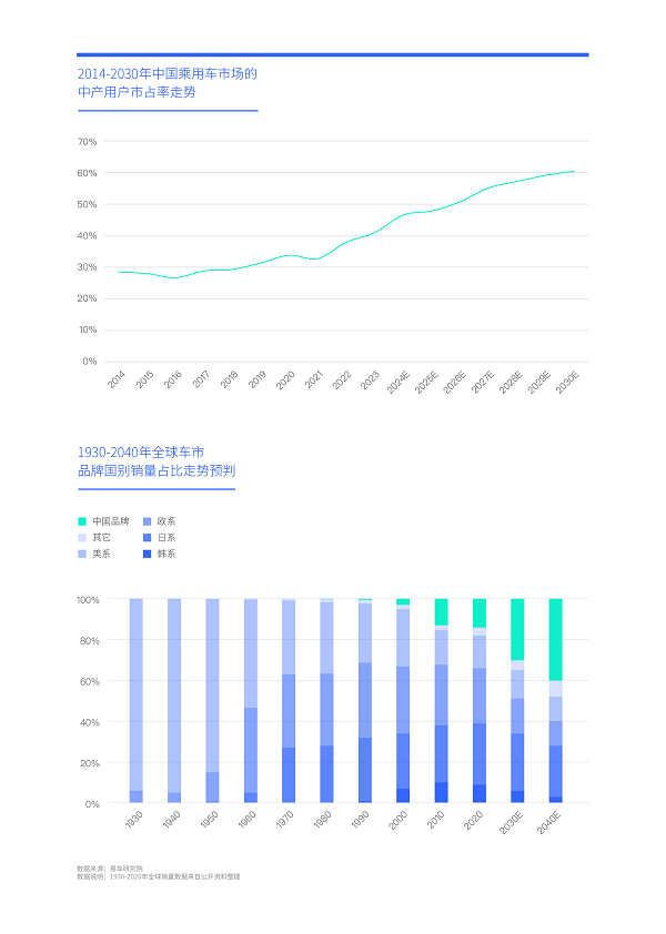 过去二十多年,广大海外车企基于工薪主导的中国车市,不仅称霸了中国车市,而且积极反哺了全球车市。未来二十年,一旦中产全面主导中国车市,且中国品牌取得全面优势地位,不仅会改写中国车市的竞争格局,也会重塑全球车市的竞争格局。预判2030年中国品牌占全球的销量有望达到30%,2040年有望挑战40%;