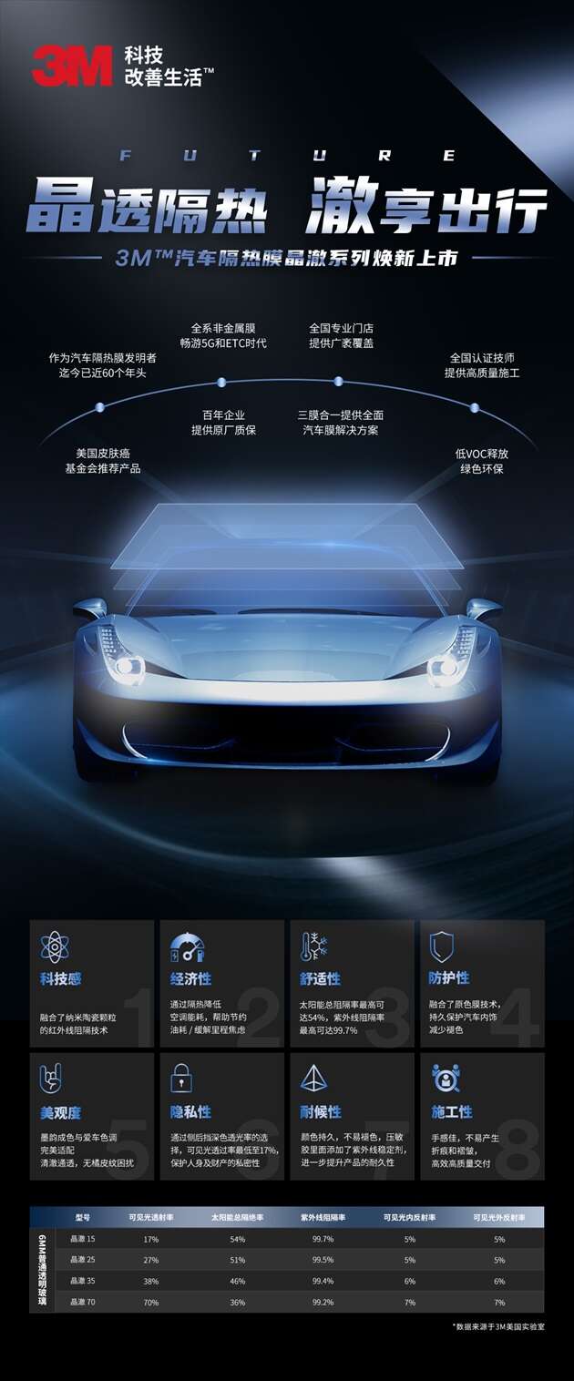 伴随着更高科技、更新体验、更优质量的精准需求洞察,3M™汽车隔热膜晶澈系列隔热能力全面提升、颜色持久稳定不褪色、高品质耐用和贴装外观更好看、更多可见光透光率选择,是开启高品质贴膜新时代的理想选择。