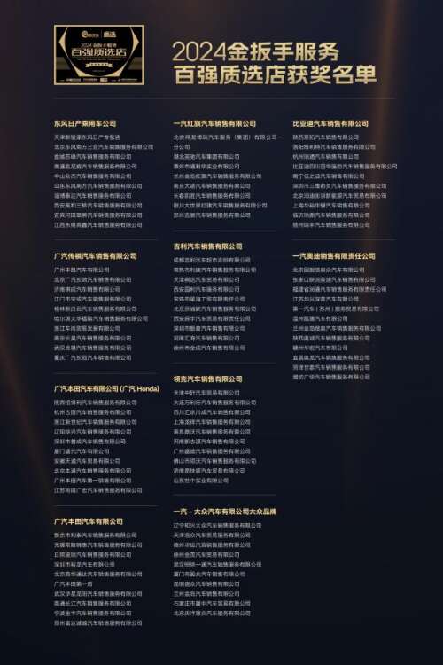为了树立品牌服务标杆榜样,助力提升汽车服务质量,促进良好市场环境,主办方同期举办了2024金扳手服务百强质选店评选活动,该评选由中国汽车维修行业协会指导,依据金扳手GES-150服务评价标准和《放心汽修认证》团体标准,对候选经销商进行专业评审,最终共有10个品牌的全国100家优秀经销商获得“2024金扳手服务百强质选店”荣誉称号,他们代表了行业顶级水准的“金扳手”服务。